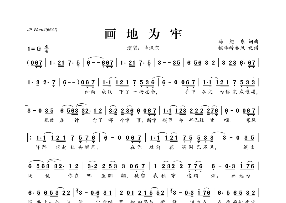 《画地为牢》是马旭东演唱的一首歌曲,拍号为4/4拍,这份简谱共有一张高清图谱,图谱由 @桃李醉春风 编配上传。