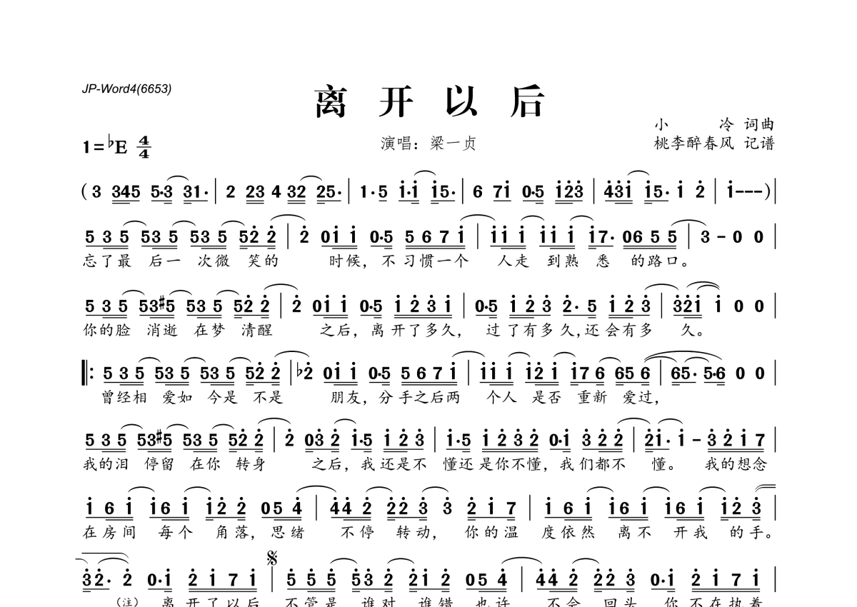 《离开以后》是梁一贞演唱的一首歌曲,拍号为4/4拍,这份简谱共有一张高清图谱,图谱由 @桃李醉春风 编配上传。