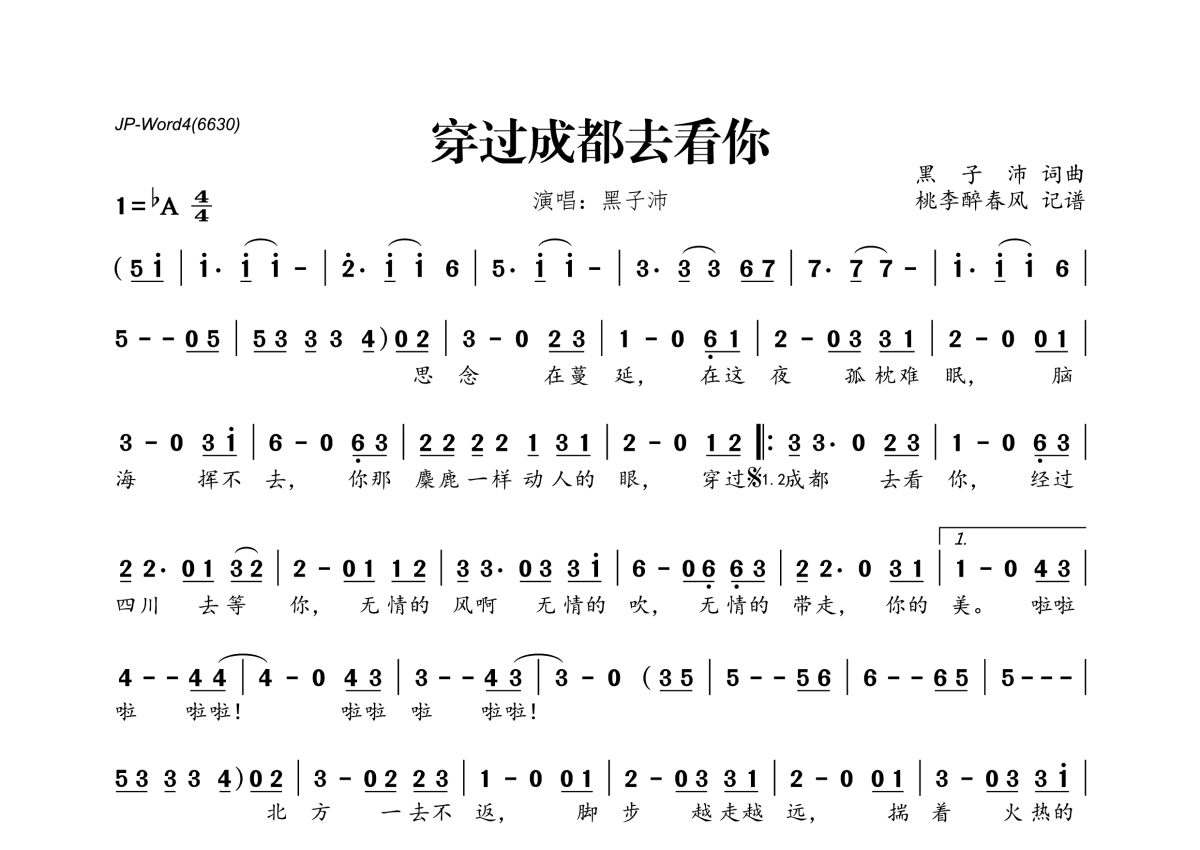 《穿过成都去看你》是黑子沛演唱的一首歌曲,拍号为4/4拍,这份简谱共有一张高清图谱,图谱由 @桃李醉春风 编配上传。