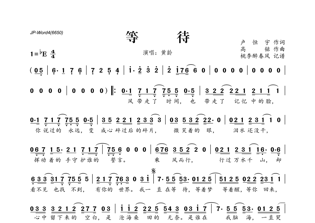 《等待》是黄龄演唱的一首歌曲,拍号为4/4拍,这份简谱共有一张高清图谱,图谱由 @桃李醉春风 编配上传。