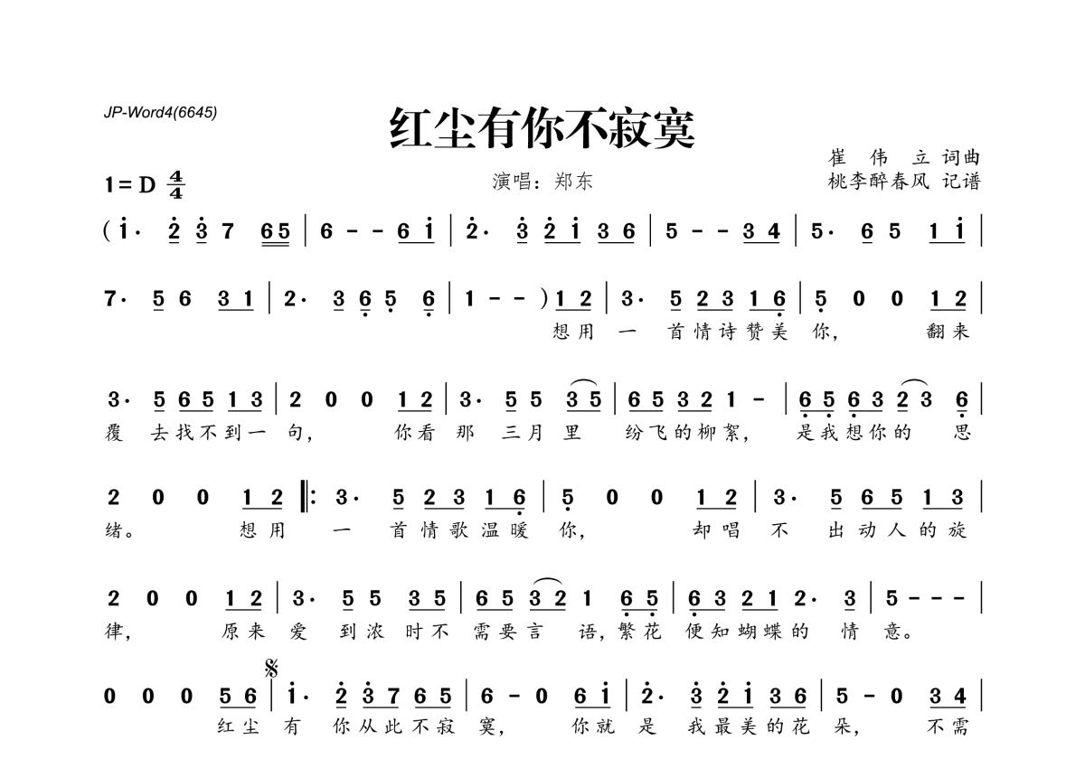 《红尘有你不寂寞》是郑东演唱的一首歌曲,拍号为4/4拍,这份简谱共有一张高清图谱,图谱由 @桃李醉春风 编配上传。