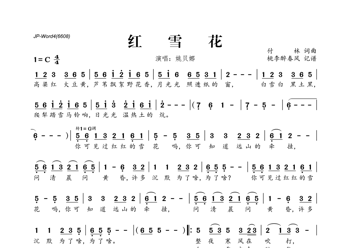 《红雪花》是姚贝娜演唱的一首歌曲,拍号为4/4拍,这份简谱共有一张高清图谱,图谱由 @桃李醉春风 编配上传。
