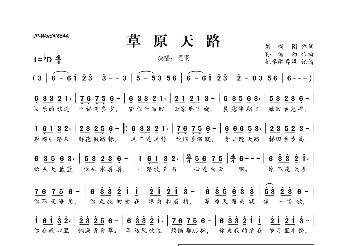 《草原天路》是嘿羽演唱的一首歌曲,拍号为4/4拍,这份简谱共有一张高清图谱,图谱由 @桃李醉春风 编配上传。