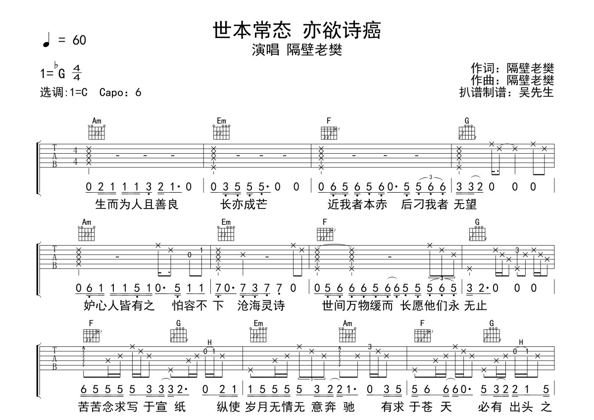 隔壁老樊《世本常态》吉他谱 - C调弹唱六线谱