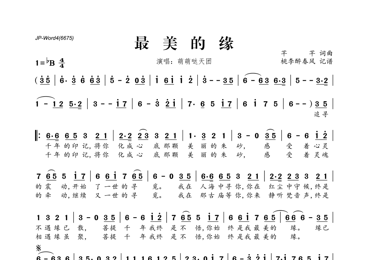 《最美的缘》是萌萌哒天团演唱的一首歌曲,拍号为4/4拍,这份简谱共有一张高清图谱,图谱由 @桃李醉春风 编配上传。