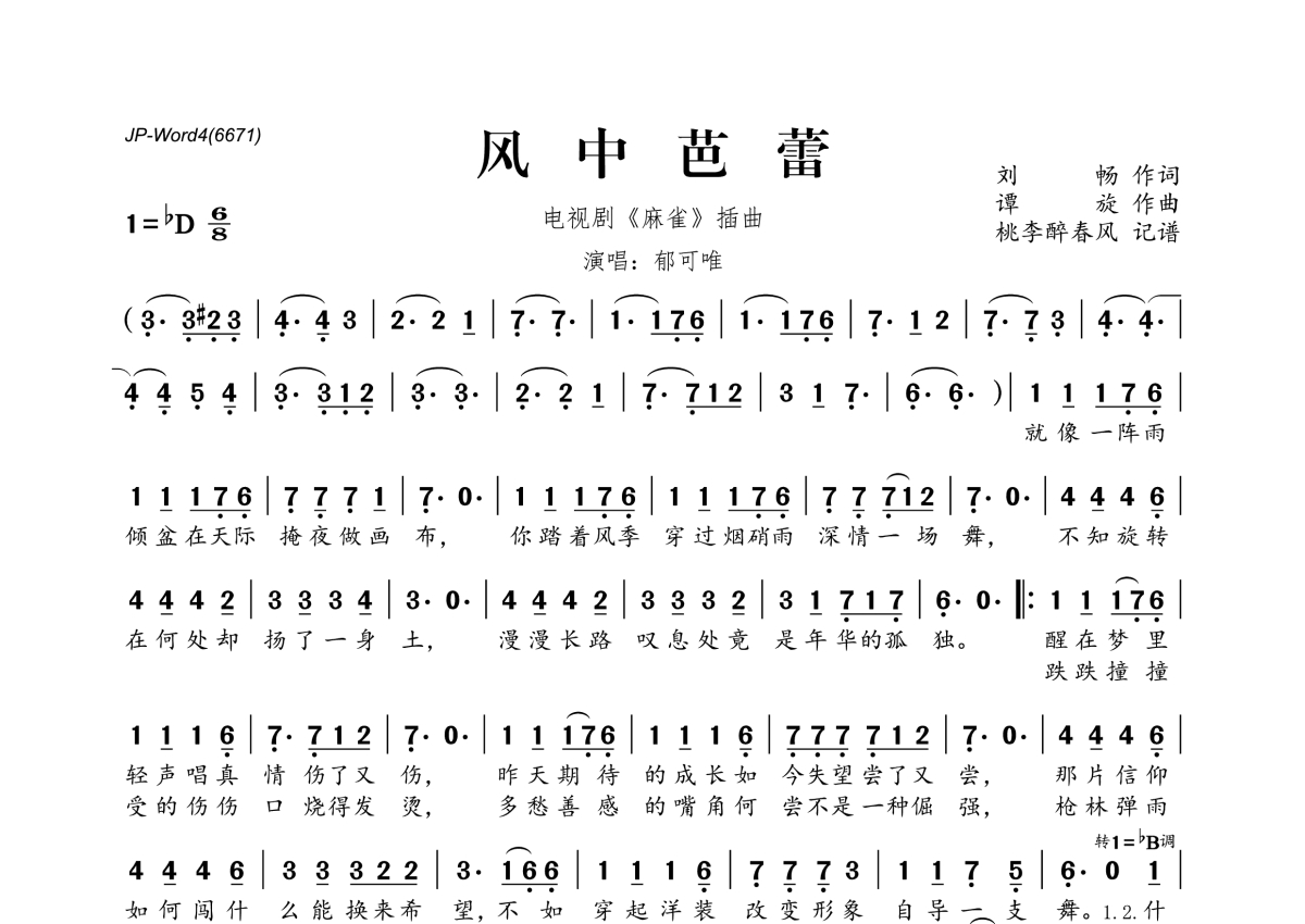 《风中芭蕾》是郁可唯演唱的一首歌曲,拍号为6/8拍,这份简谱共有一张高清图谱,图谱由 @桃李醉春风 编配上传。