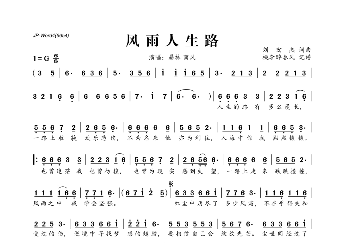 《风雨人生路》是暴林&姜海龙(南风)演唱的一首歌曲,拍号为6/8拍,这份简谱共有一张高清图谱,图谱由 @桃李醉春风 编配上传。