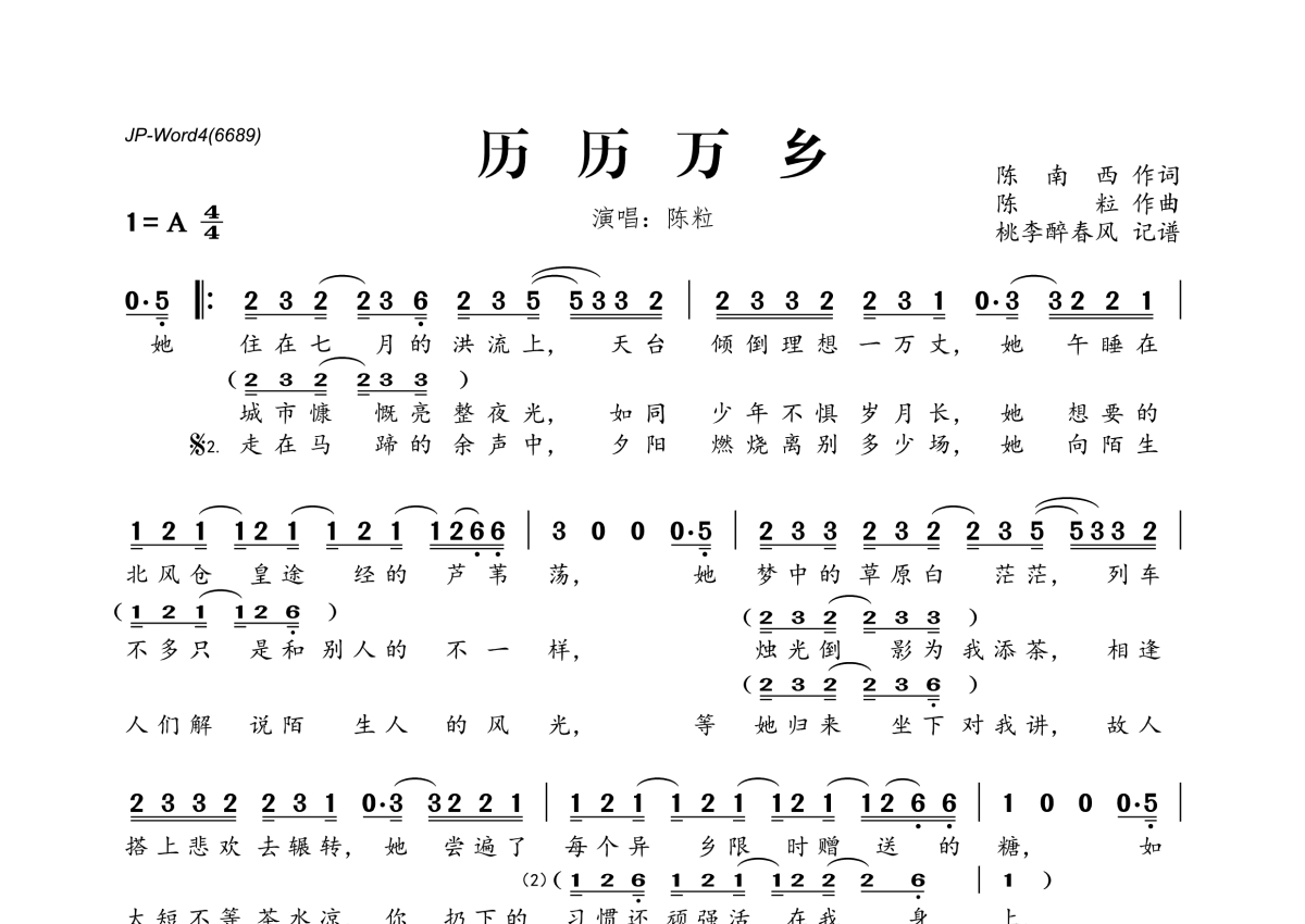 《历历万乡》是陈粒演唱的一首歌曲,拍号为4/4拍,这份简谱共有一张高清图谱,图谱由 @桃李醉春风 编配上传。