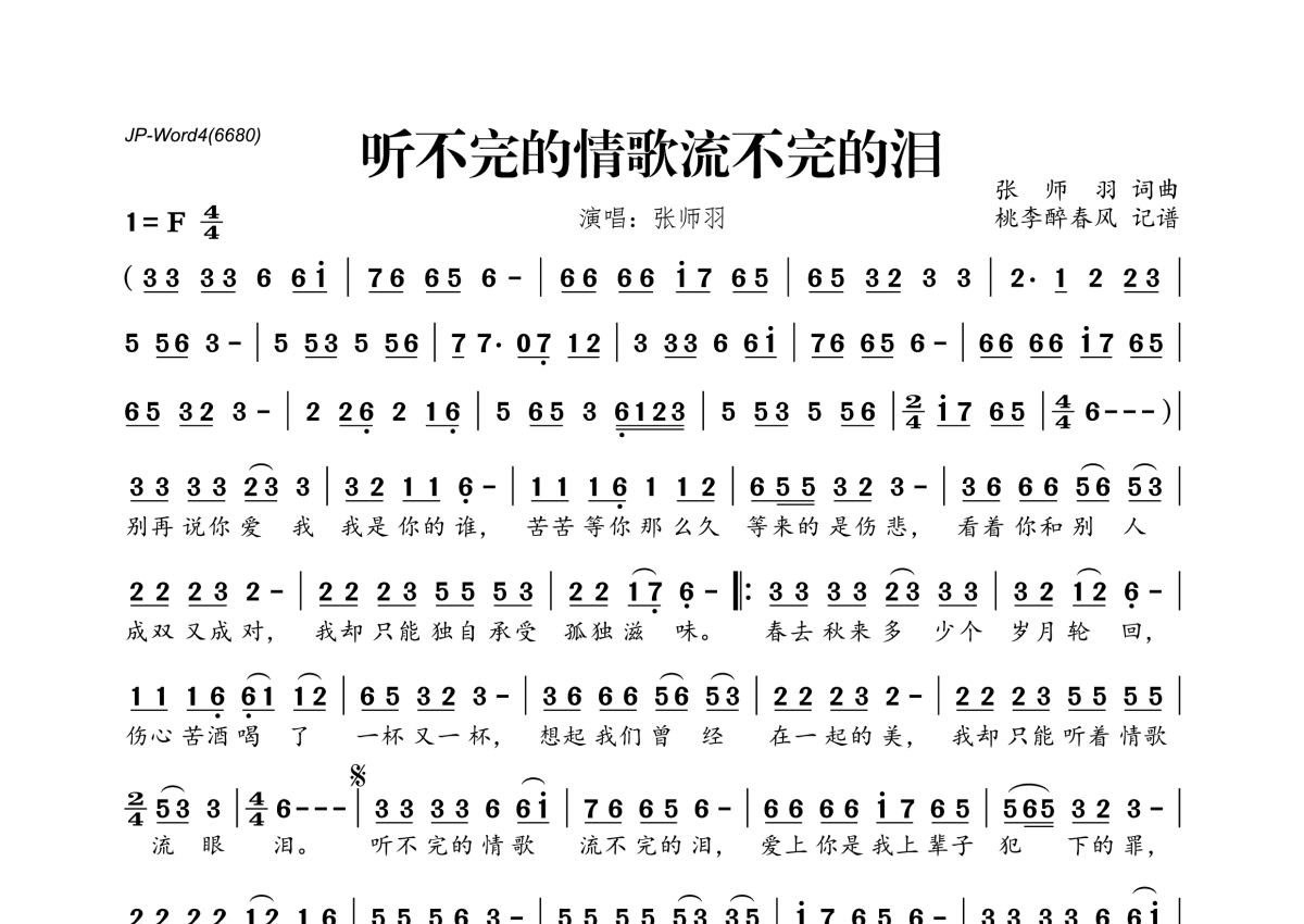 《听不完的情歌流不完的泪》是张师羽演唱的一首歌曲,拍号为4/4拍,这份简谱共有一张高清图谱,图谱由 @桃李醉春风 编配上传。