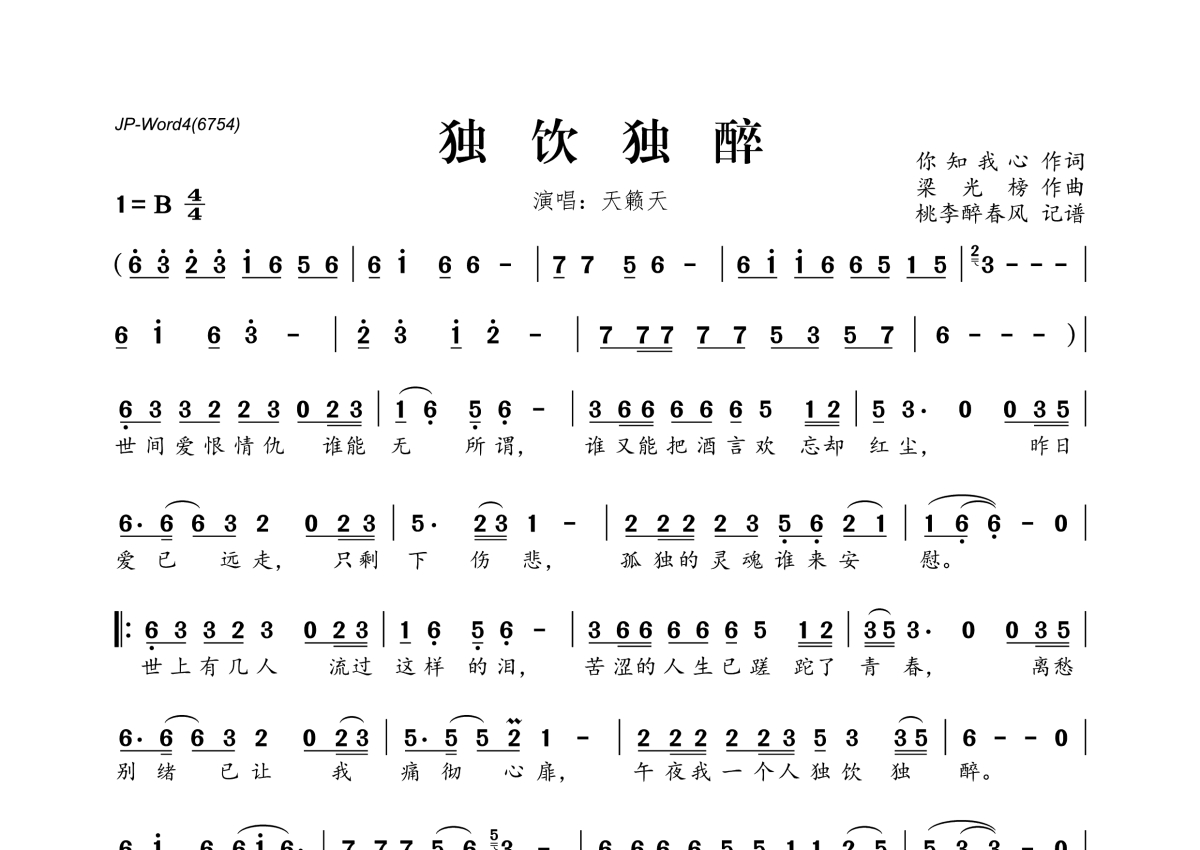 《独饮独醉》是天籁天演唱的一首歌曲,拍号为4/4拍,这份简谱共有一张高清图谱,图谱由 @桃李醉春风 编配上传。