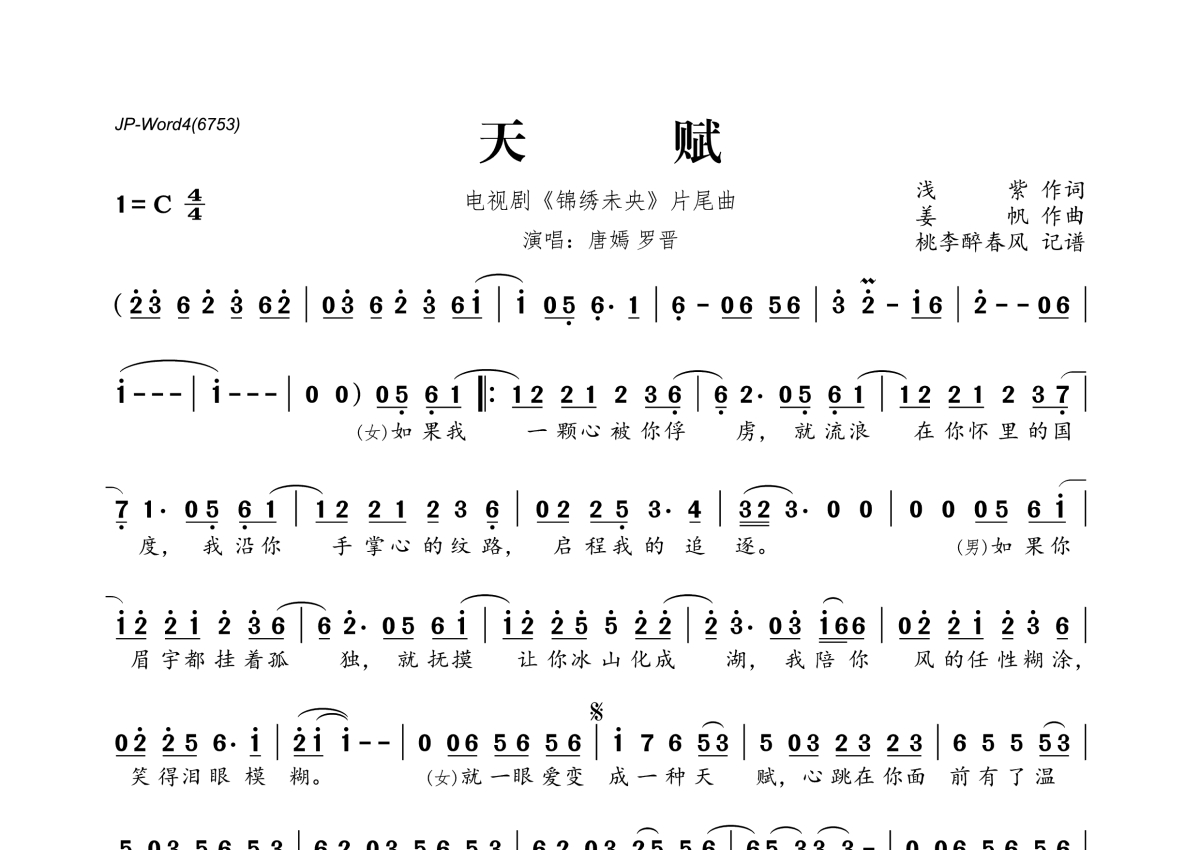 《天赋》是唐嫣&罗晋演唱的一首歌曲,拍号为4/4拍,这份简谱共有一张高清图谱,图谱由 @桃李醉春风 编配上传。