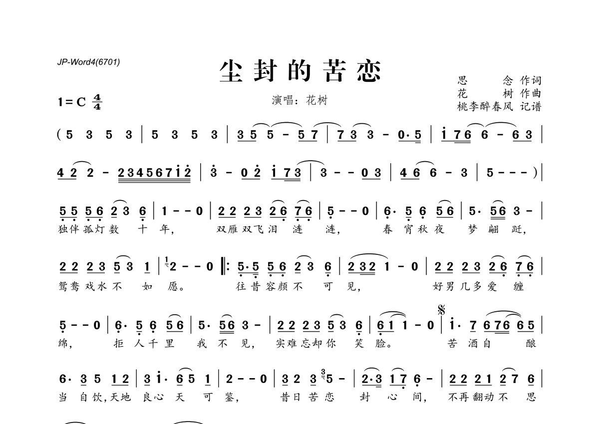 《尘封的苦恋》是花树演唱的一首歌曲,拍号为4/4拍,这份简谱共有一张高清图谱,图谱由 @桃李醉春风 编配上传。