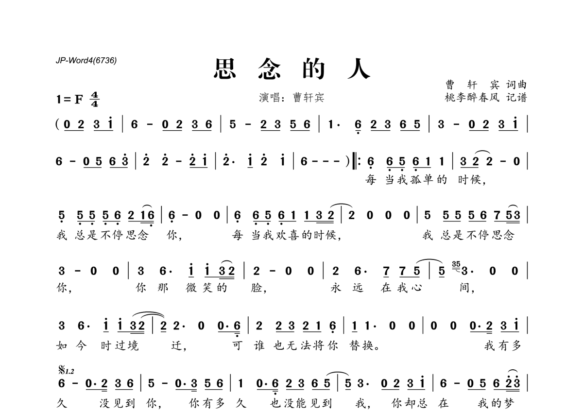 曹轩宾《思念的人》简谱