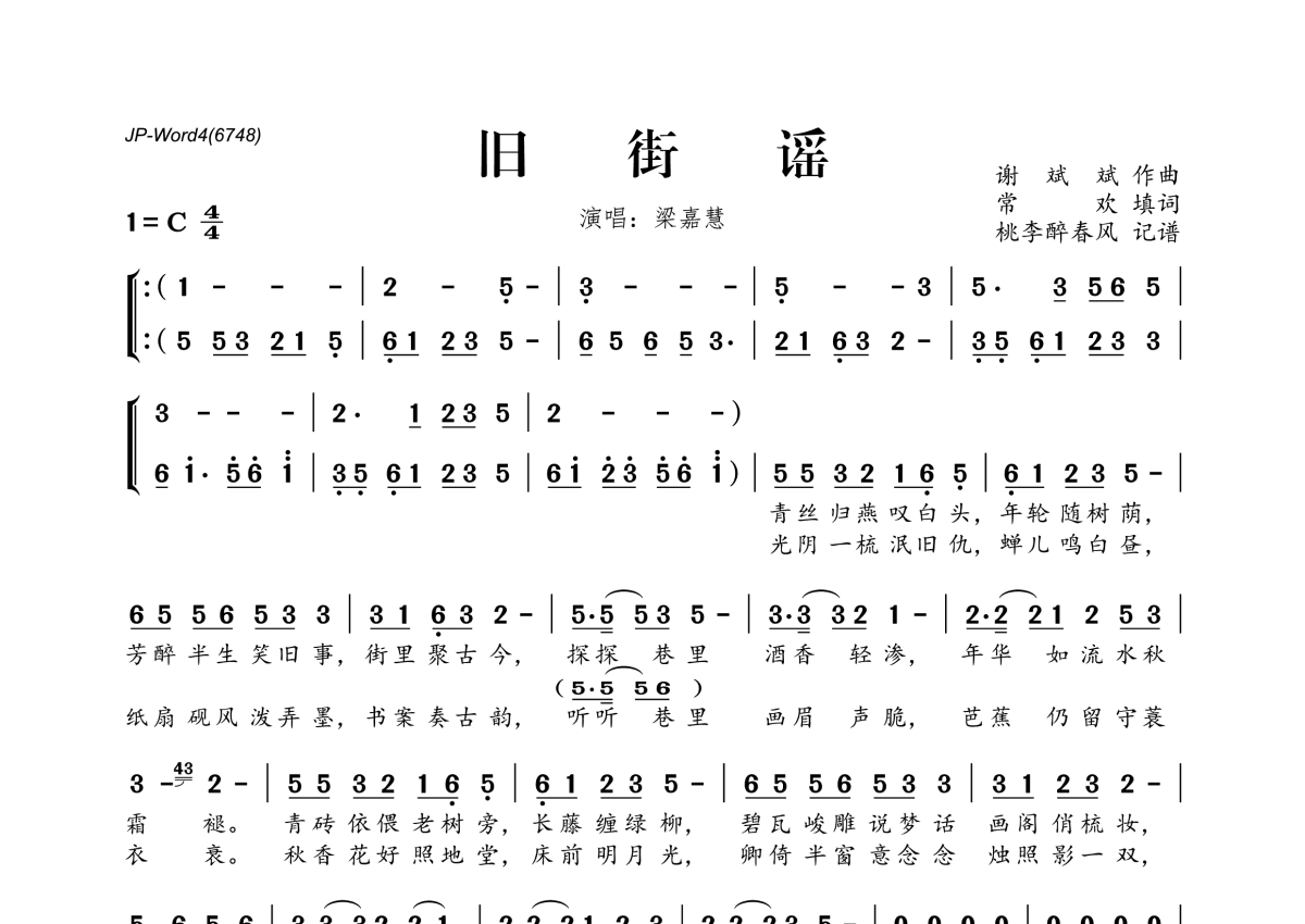 《旧街谣》是梁嘉慧演唱的一首歌曲,拍号为4/4拍,这份简谱共有一张高清图谱,图谱由 @桃李醉春风 编配上传。