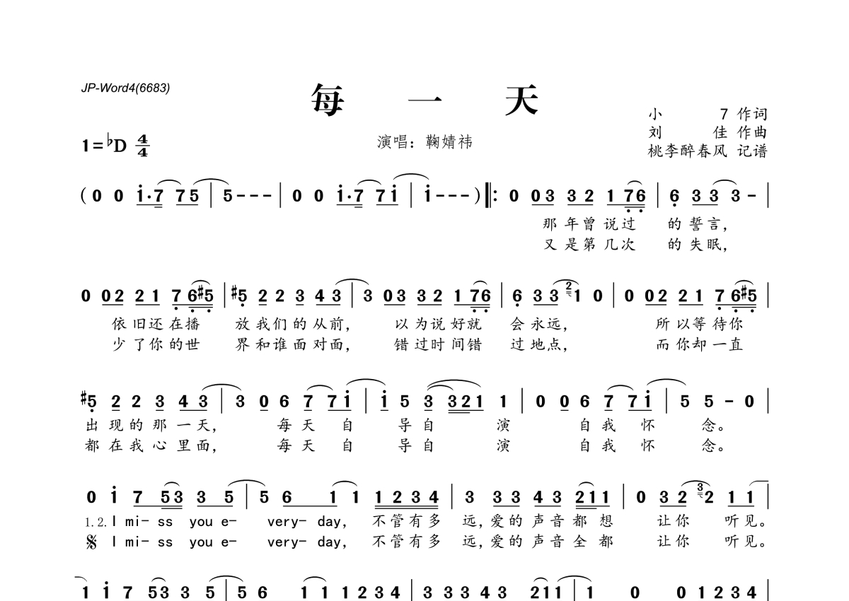 《每一天》是鞠婧祎演唱的一首歌曲,拍号为4/4拍,这份简谱共有一张高清图谱,图谱由 @桃李醉春风 编配上传。