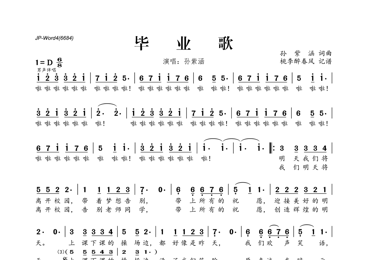 《毕业歌》是孙子涵演唱的一首歌曲,拍号为6/8拍,这份简谱共有两张高清图谱,图谱由 @桃李醉春风 编配上传。