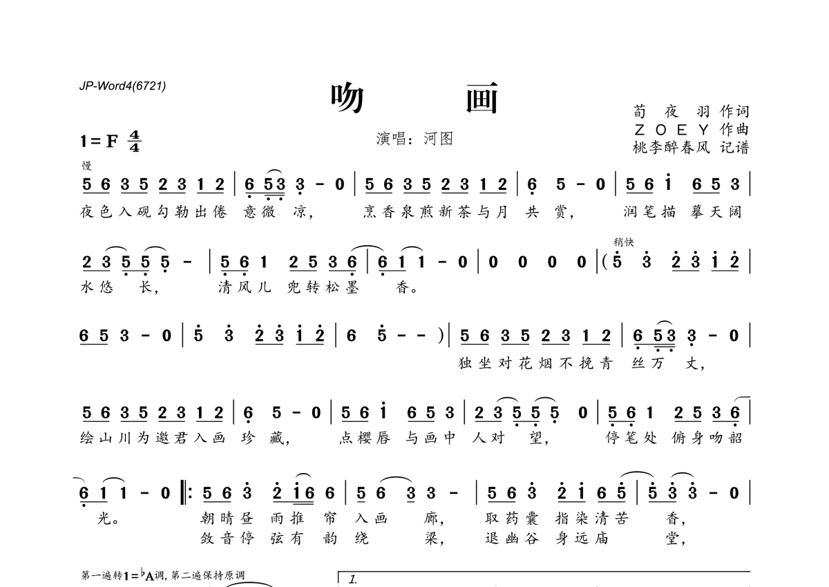 《吻画》是河图演唱的一首歌曲,拍号为4/4拍,这份简谱共有一张高清图谱,图谱由 @桃李醉春风 编配上传。