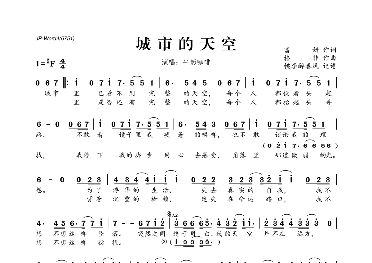 《城市的天空》是牛奶咖啡演唱的一首歌曲,拍号为4/4拍,这份简谱共有一张高清图谱,图谱由 @桃李醉春风 编配上传。