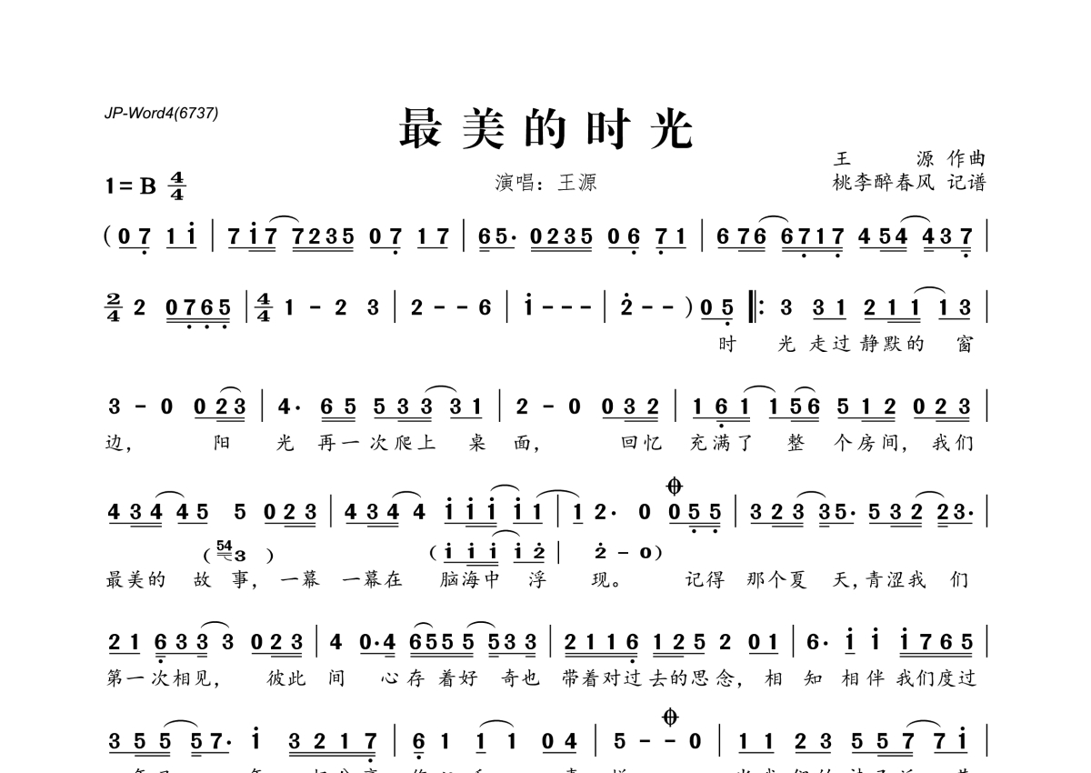 《最美的时光》是王源演唱的一首歌曲,拍号为4/4拍,这份简谱共有一张高清图谱,图谱由 @桃李醉春风 编配上传。