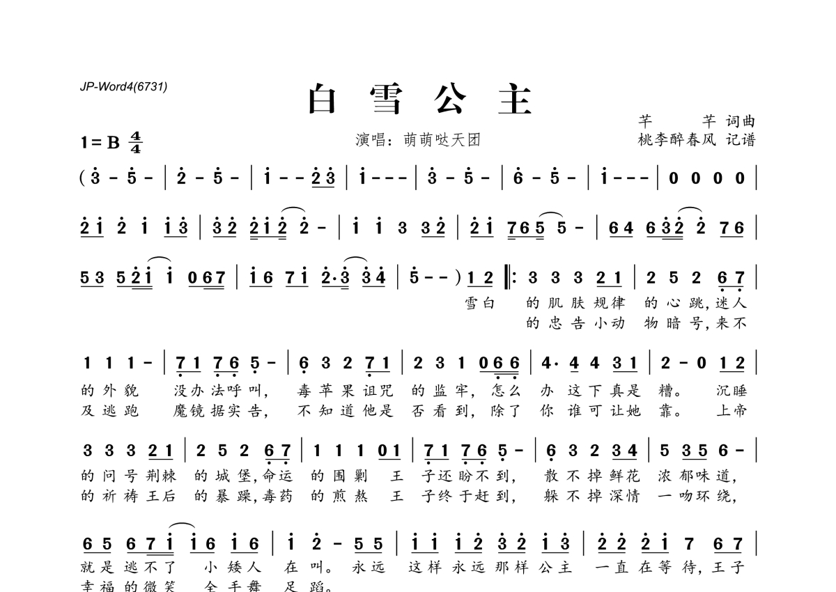 《白雪公主》是萌萌哒天团演唱的一首歌曲,拍号为4/4拍,这份简谱共有一张高清图谱,图谱由 @桃李醉春风 编配上传。