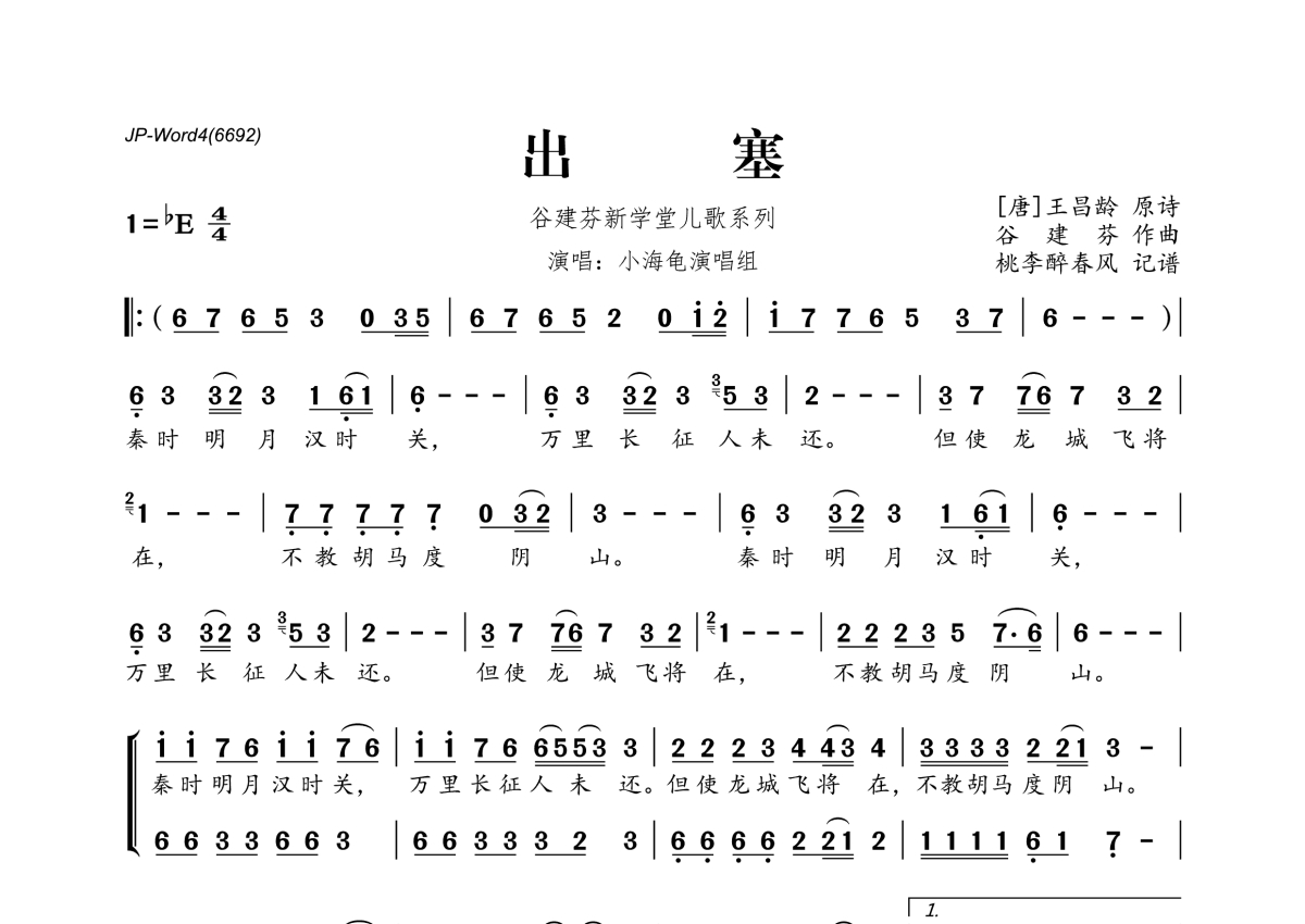 《出塞》是谷建芬新学堂儿歌系列演唱的一首歌曲,拍号为4/4拍,这份简谱共有一张高清图谱,图谱由 @桃李醉春风 编配上传。