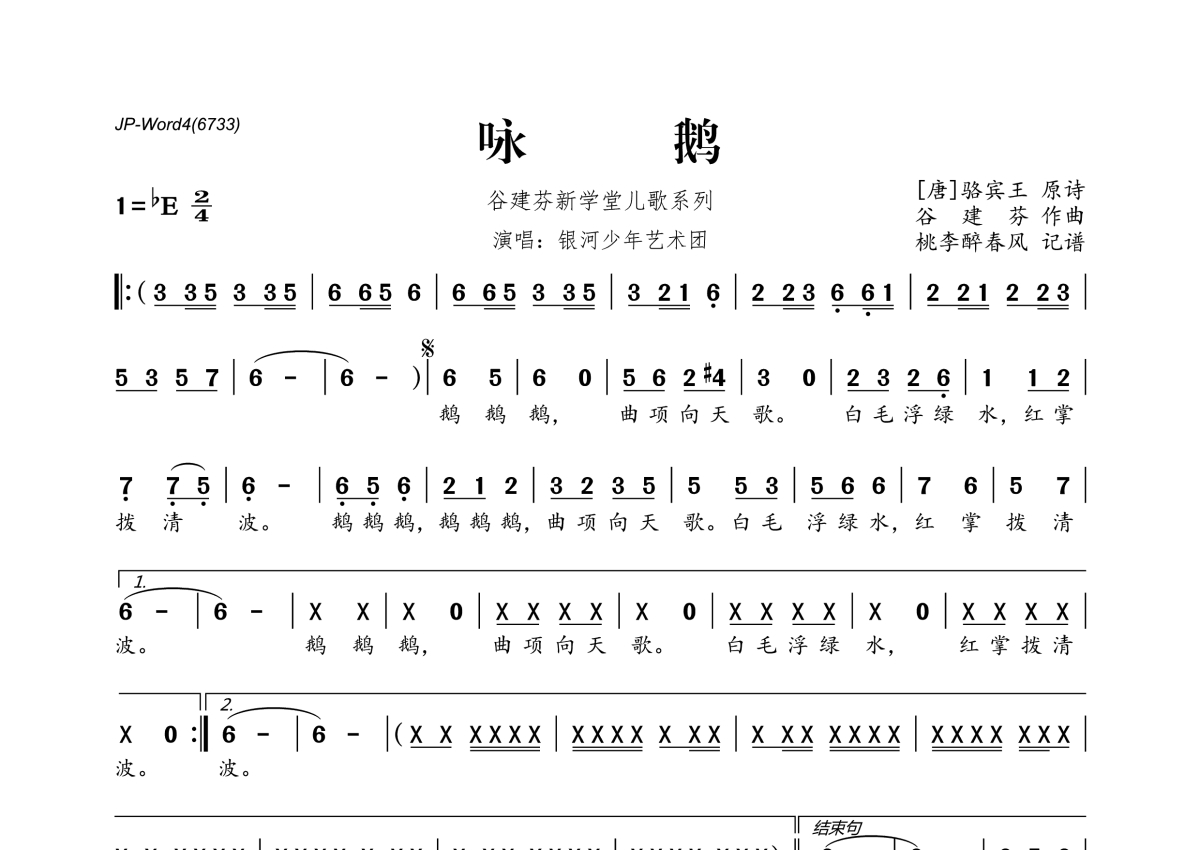 《咏鹅》是谷建芬新学堂儿歌系列演唱的一首歌曲,拍号为2/4拍,这份简谱共有一张高清图谱,图谱由 @桃李醉春风 编配上传。