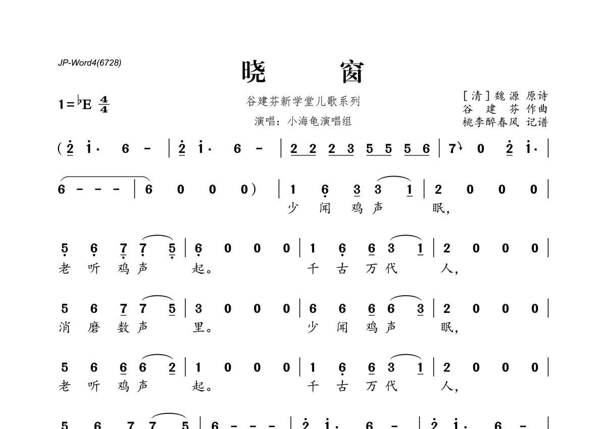 《晓窗》是谷建芬新学堂儿歌系列演唱的一首歌曲,拍号为4/4拍,这份简谱共有一张高清图谱,图谱由 @桃李醉春风 编配上传。