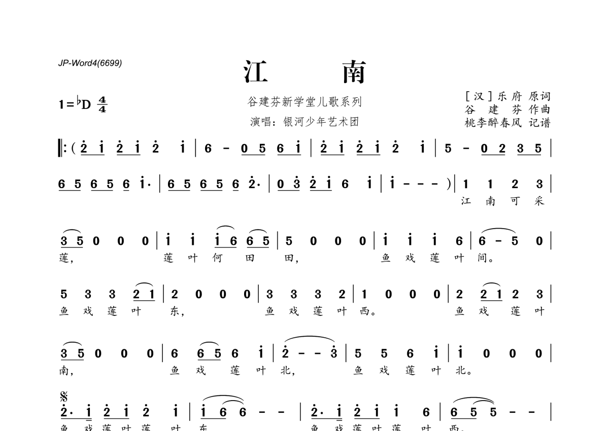 《江南》是谷建芬新学堂儿歌系列演唱的一首歌曲,拍号为4/4拍,这份简谱共有一张高清图谱,图谱由 @桃李醉春风 编配上传。