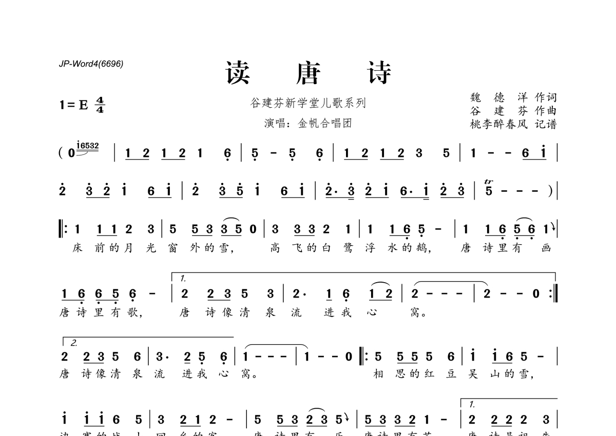 《读唐诗》是谷建芬新学堂儿歌系列演唱的一首歌曲,拍号为4/4拍,这份简谱共有一张高清图谱,图谱由 @桃李醉春风 编配上传。