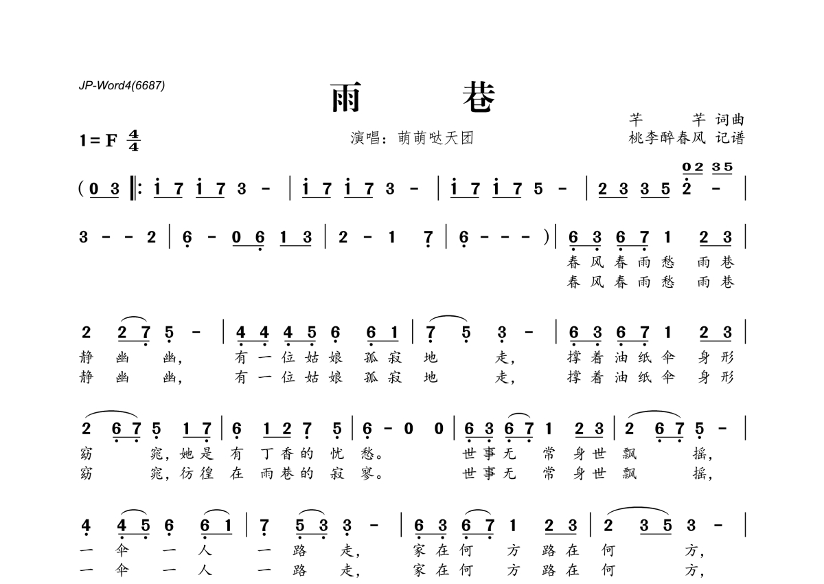《雨巷》是萌萌哒天团演唱的一首歌曲,拍号为4/4拍,这份简谱共有一张高清图谱,图谱由 @桃李醉春风 编配上传。