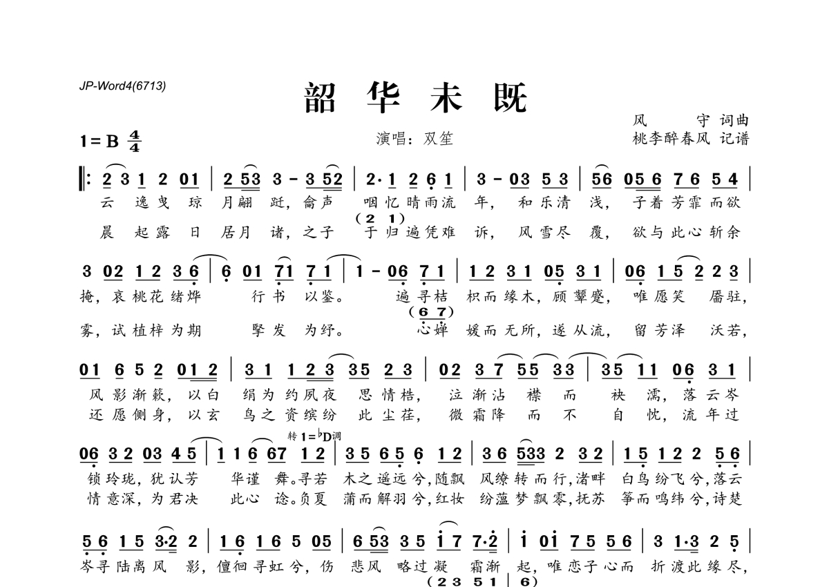 《韶华未既》是双笙演唱的一首歌曲,拍号为4/4拍,这份简谱共有一张高清图谱,图谱由 @桃李醉春风 编配上传。