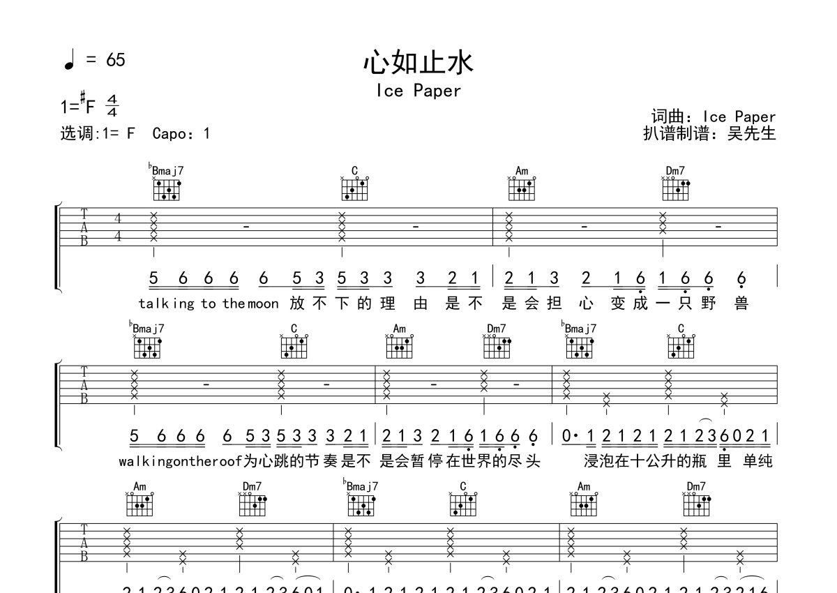 Ice Paper《心如止水》吉他谱 - F调弹唱六线谱