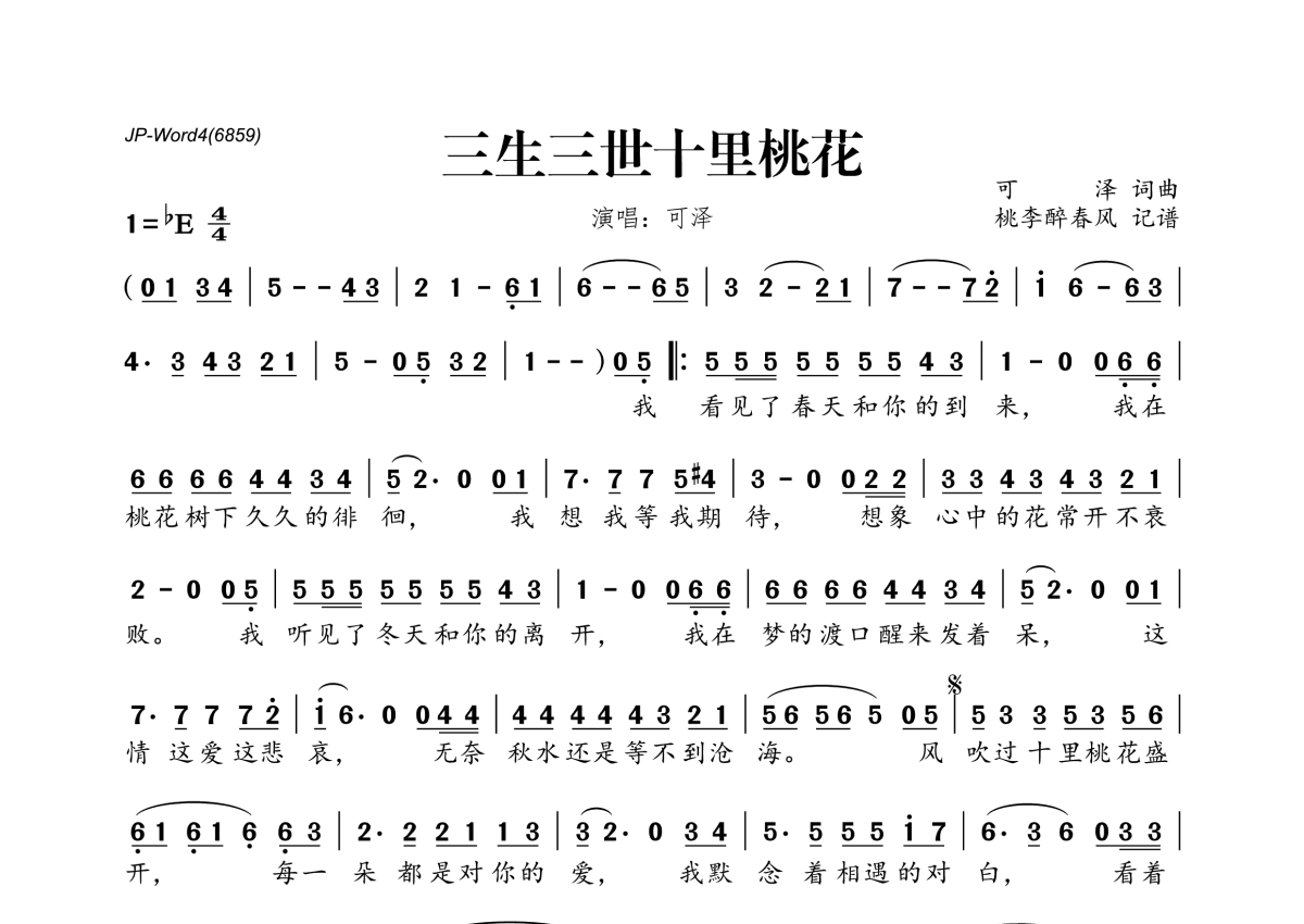 《三生三世十里桃花》是可泽演唱的一首歌曲,拍号为4/4拍,这份简谱共有一张高清图谱,图谱由 @桃李醉春风 编配上传。