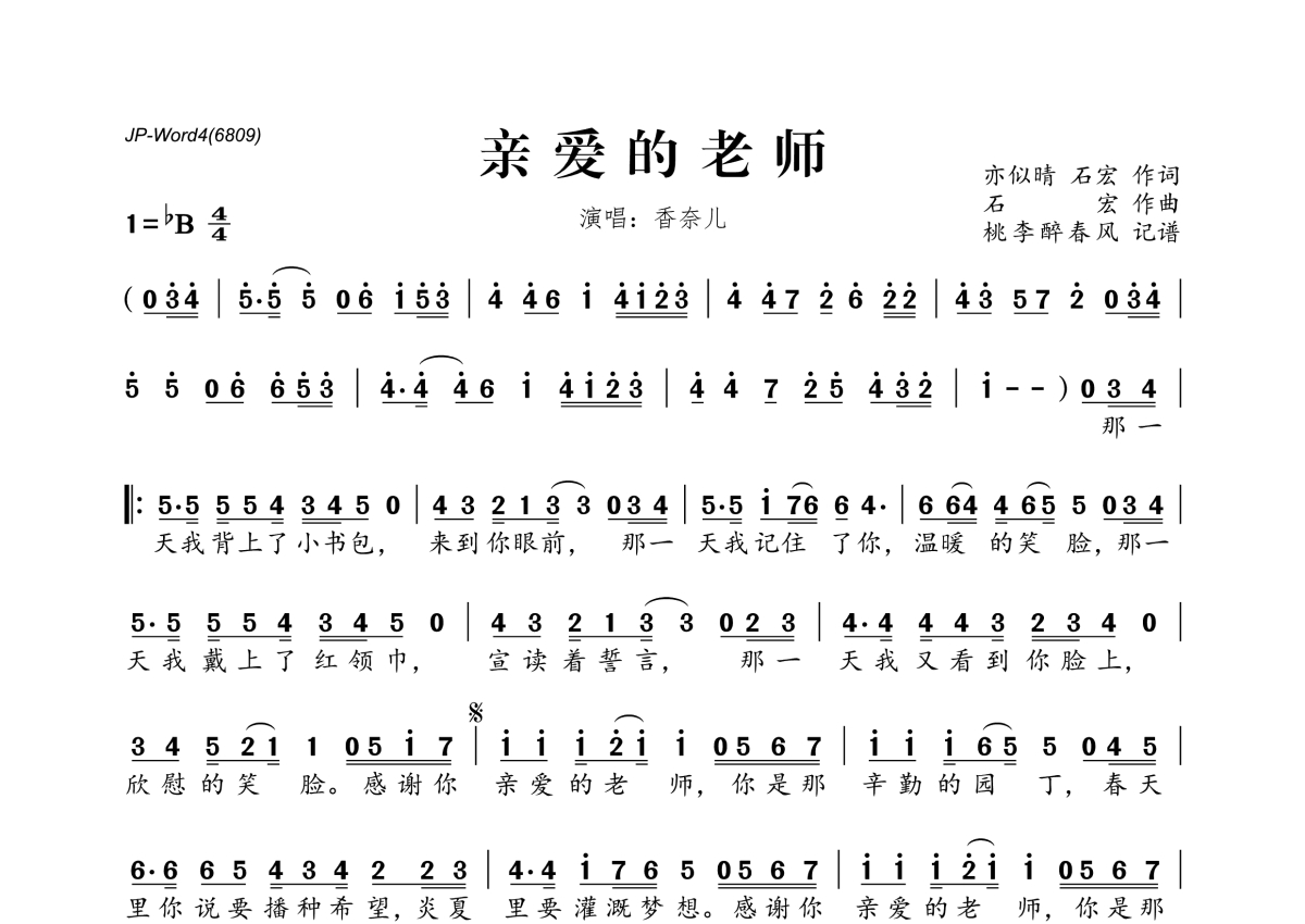 《亲爱的老师》是香奈儿演唱的一首歌曲,拍号为4/4拍,这份简谱共有一张高清图谱,图谱由 @桃李醉春风 编配上传。