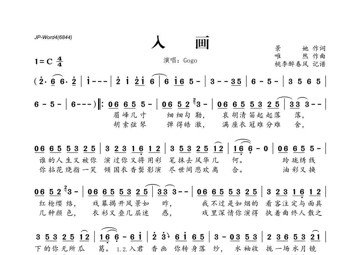 《入画》是GOGO演唱的一首歌曲,拍号为4/4拍,这份简谱共有一张高清图谱,图谱由 @桃李醉春风 编配上传。
