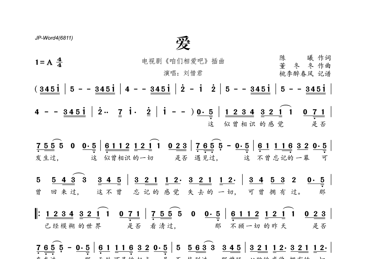 《爱》是刘惜君演唱的一首歌曲,拍号为4/4拍,这份简谱共有一张高清图谱,图谱由 @桃李醉春风 编配上传。