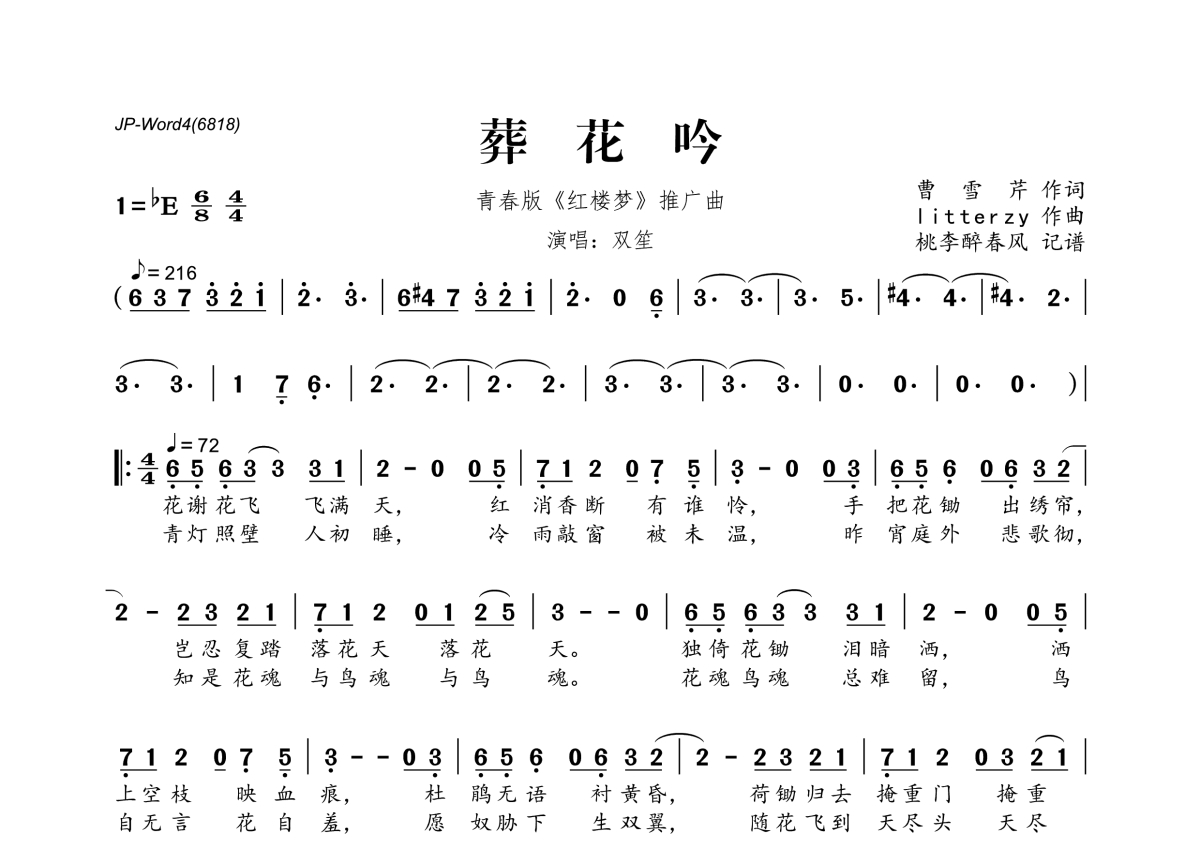 《葬花吟》是双笙演唱的一首歌曲,拍号为4/4拍,这份简谱共有一张高清图谱,图谱由 @桃李醉春风 编配上传。