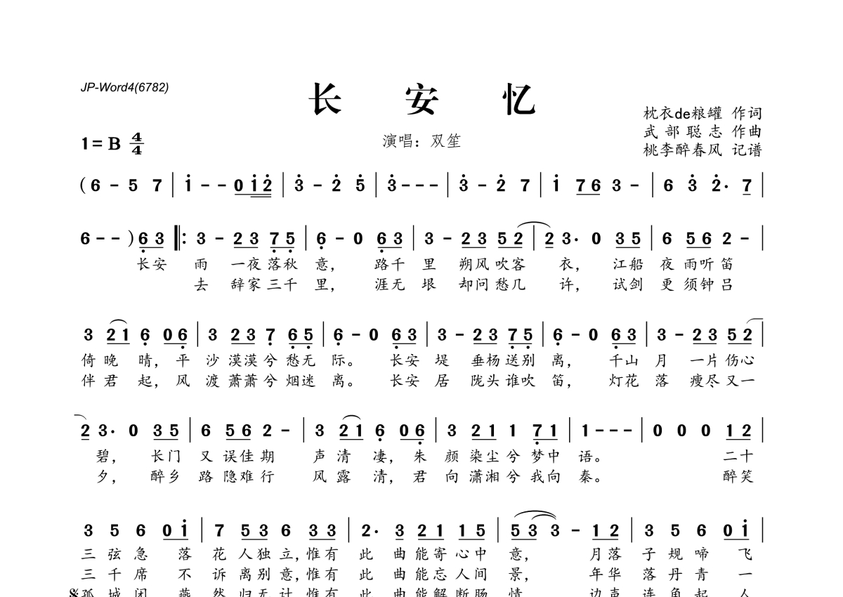 《长安忆》是双笙演唱的一首歌曲,拍号为4/4拍,这份简谱共有一张高清图谱,图谱由 @桃李醉春风 编配上传。