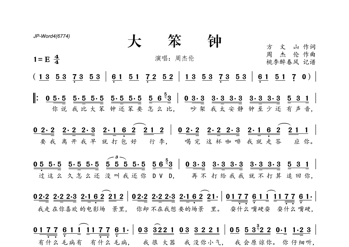 《大笨钟》是周杰伦演唱的一首歌曲,拍号为4/4拍,这份简谱共有一张高清图谱,图谱由 @桃李醉春风 编配上传。