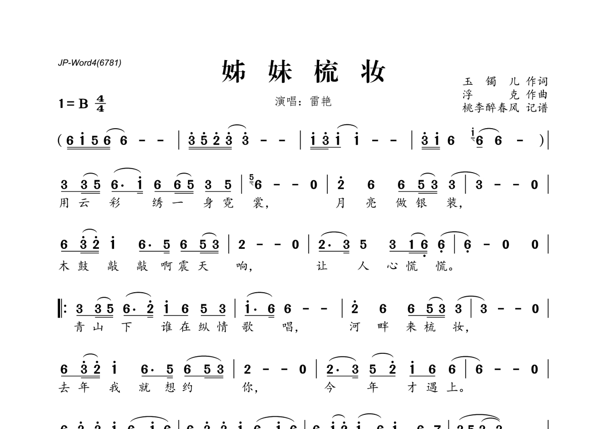 《姊妹梳妆》是雷艳演唱的一首歌曲,拍号为4/4拍,这份简谱共有一张高清图谱,图谱由 @桃李醉春风 编配上传。