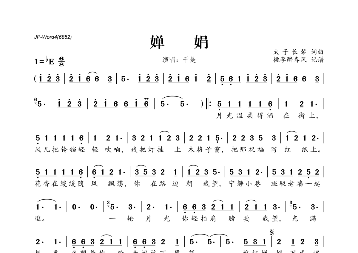 《婵娟》是千是演唱的一首歌曲,拍号为6/8拍,这份简谱共有一张高清图谱,图谱由 @桃李醉春风 编配上传。