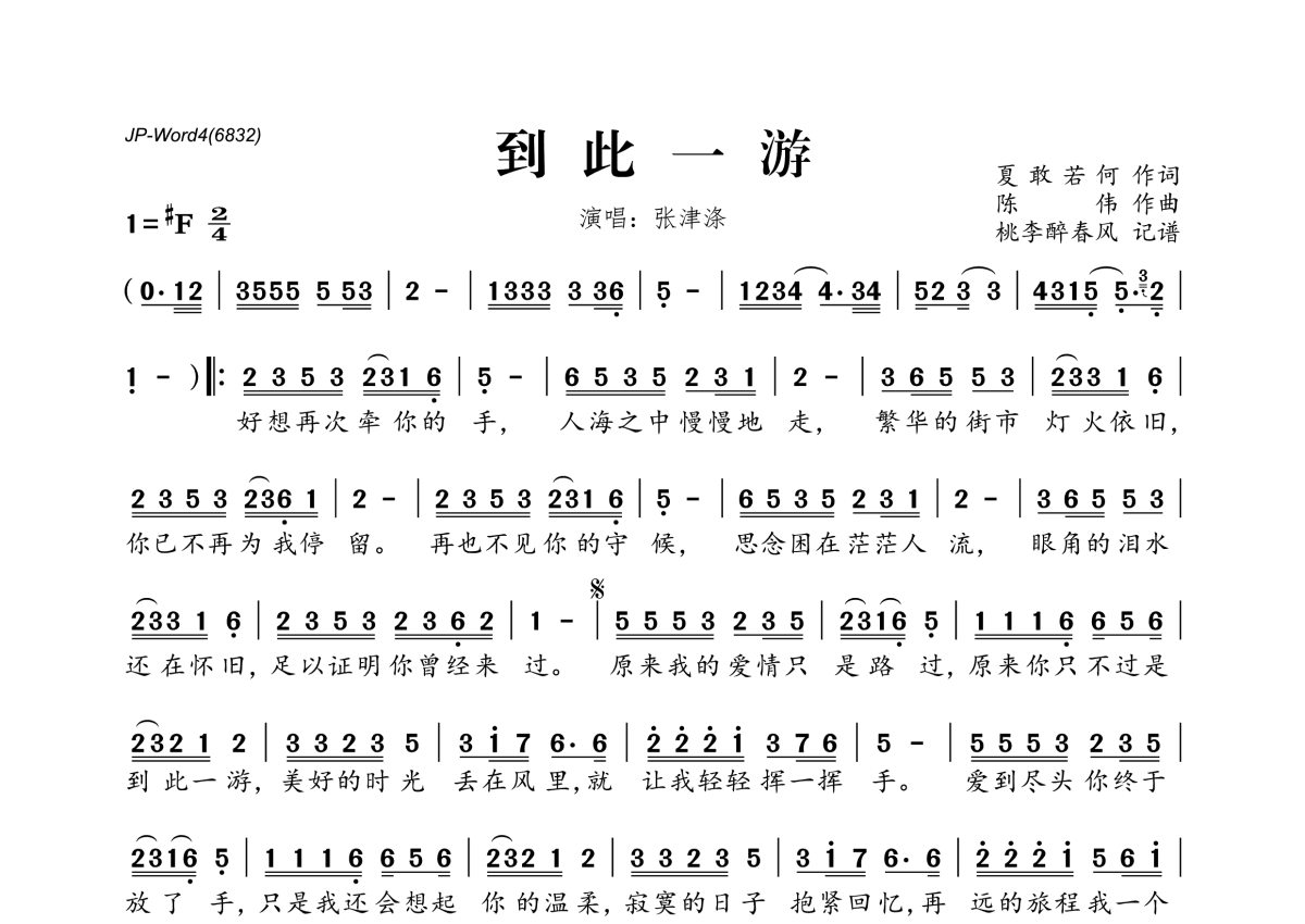 《到此一游》是张津涤演唱的一首歌曲,拍号为2/4拍,这份简谱共有一张高清图谱,图谱由 @桃李醉春风 编配上传。
