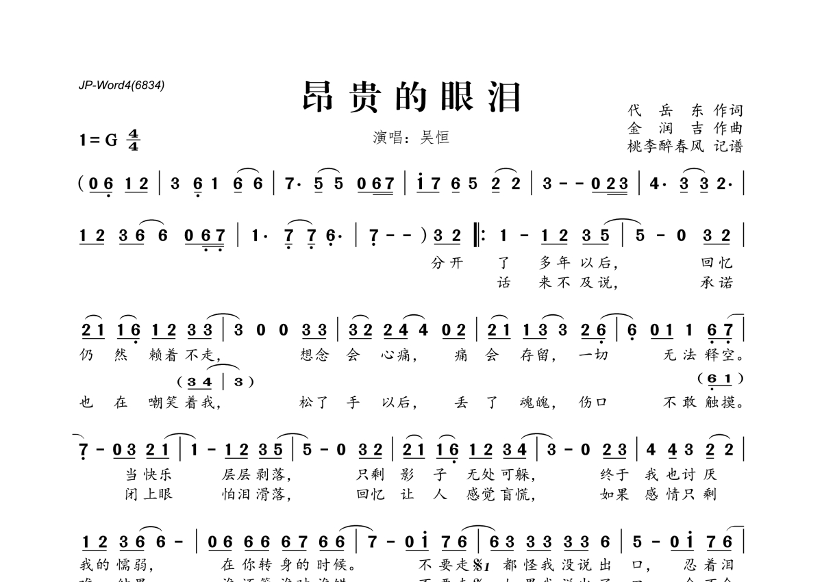 《昂贵的眼泪》是吴恒演唱的一首歌曲,拍号为4/4拍,这份简谱共有一张高清图谱,图谱由 @桃李醉春风 编配上传。