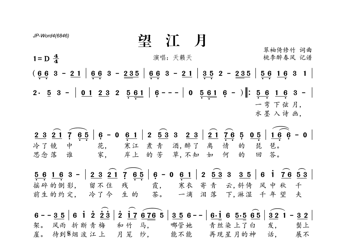 《望江月》是天籁天演唱的一首歌曲,拍号为4/4拍,这份简谱共有一张高清图谱,图谱由 @桃李醉春风 编配上传。
