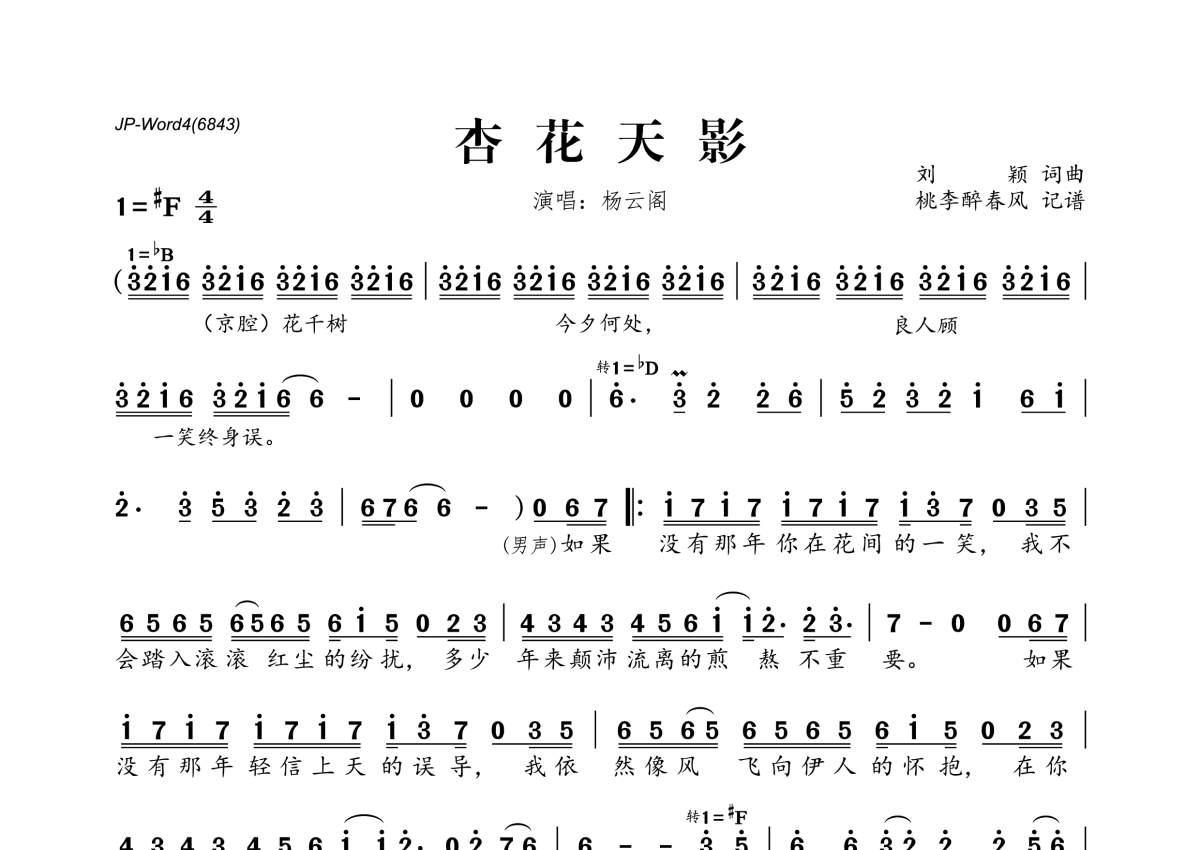 《杏花天影》是杨云阁演唱的一首歌曲,拍号为4/4拍,这份简谱共有一张高清图谱,图谱由 @桃李醉春风 编配上传。