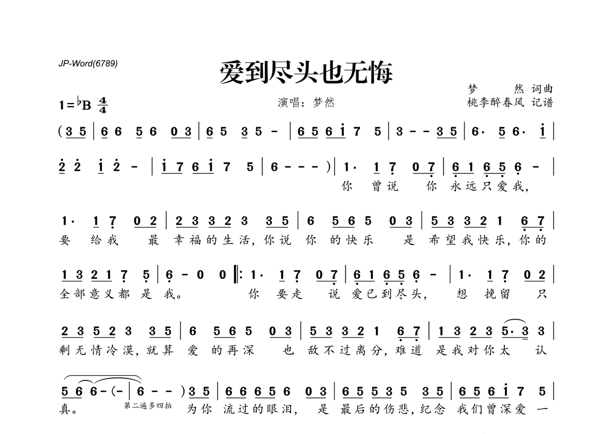 《爱到尽头也无悔》是梦然演唱的一首歌曲,拍号为4/4拍,这份简谱共有一张高清图谱,图谱由 @桃李醉春风 编配上传。