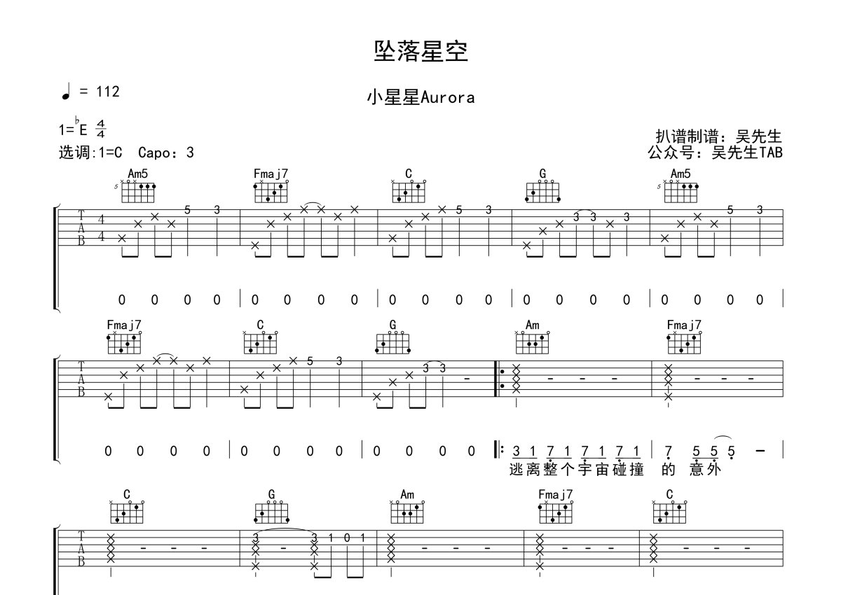 小星星Aurora《坠落星空》吉他谱 - C调弹唱六线谱