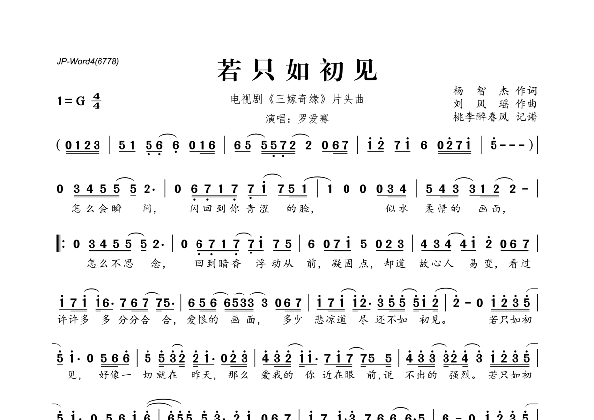 《若只如初见》是罗爱骞演唱的一首歌曲,拍号为4/4拍,这份简谱共有一张高清图谱,图谱由 @桃李醉春风 编配上传。