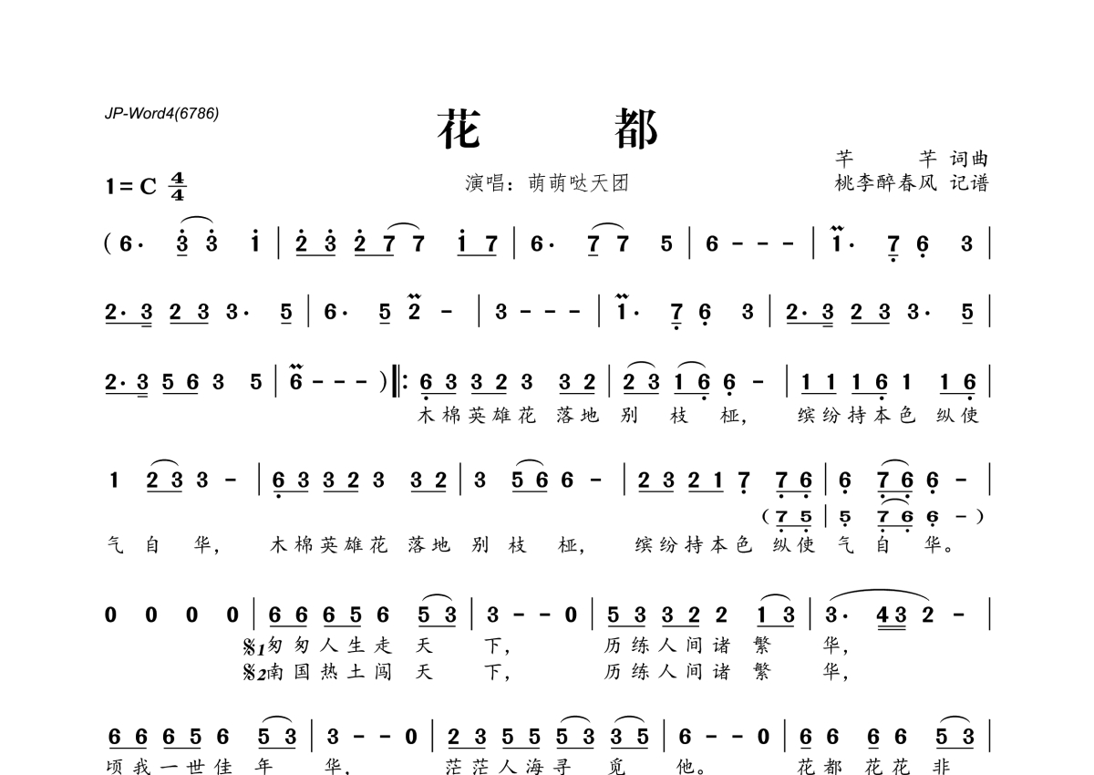 《花都》是萌萌哒天团演唱的一首歌曲,拍号为4/4拍,这份简谱共有一张高清图谱,图谱由 @桃李醉春风 编配上传。