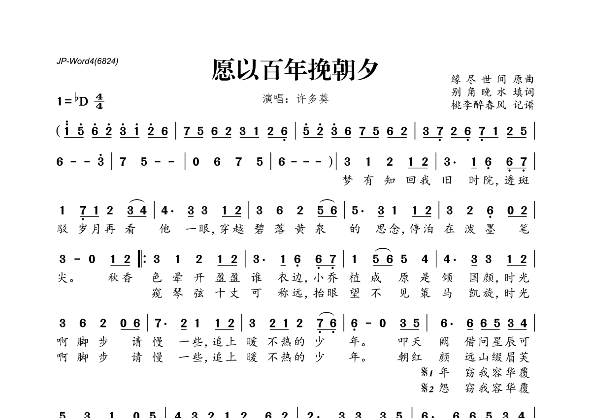 《愿以百年挽朝夕》是许多葵演唱的一首歌曲,拍号为4/4拍,这份简谱共有一张高清图谱,图谱由 @桃李醉春风 编配上传。